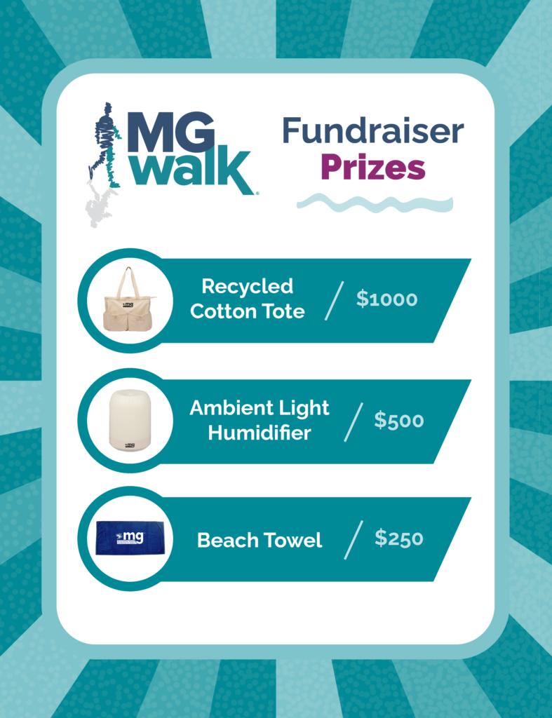 Raise funds with your MG Walk fundraising page and earn prizes as a thank you for your support!